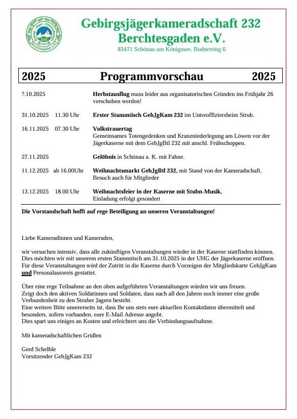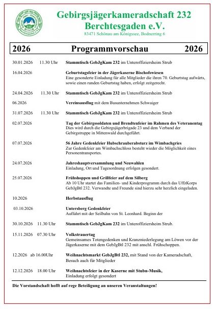 Die aktuelle Programmvorschau für 2022 finden Sie unter folgendem Link zum Download:Veranstaltungen - Gebirgsjägerkameradschaft 232