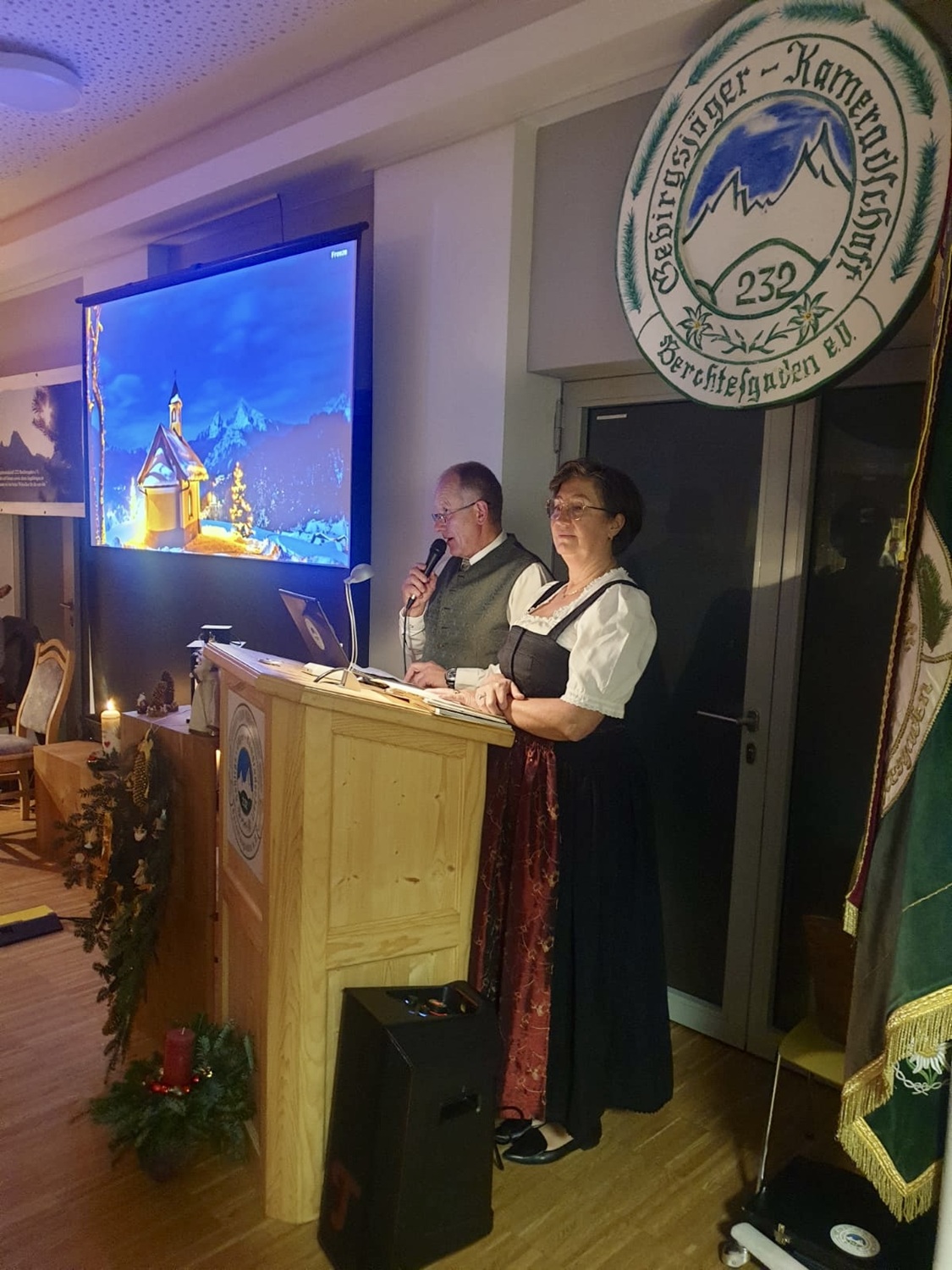 Für die weihnachtliche Stimmung des Abends sorgten in bewährter Weise, die „Kirchleiten-Musi“ und Sprecherin Gabi Bernegger, die nun zum ersten Mal die mundartlichen, fröhlichen und besinnlichen Geschichten zur Weihnachtszeit vortrug. In seiner Ansprache wies Gerd Schelble zuallererst darauf hin, nun denen zu gedenken die nicht unter uns sein können, für sie leuchtete ein Licht in unserer Kameradschaftslaterne, besonders aber gedachten wir unserem Fahnenbegleiter Peter Auer der kurz zuvor verstorben war.