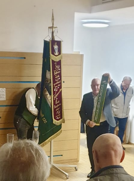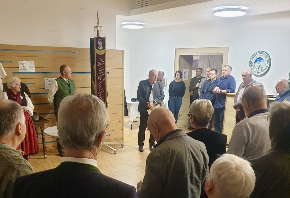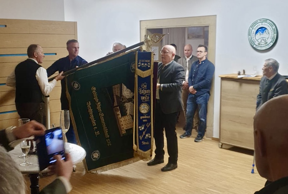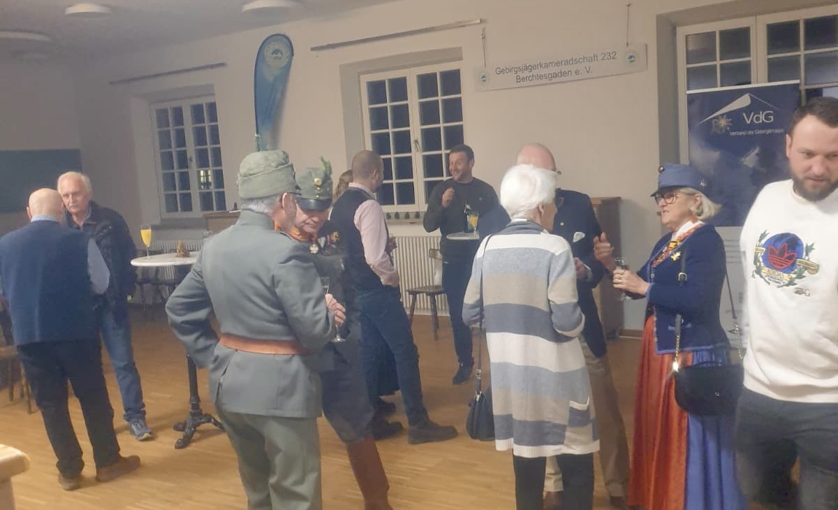 Die Kameradinnen und Kameraden fanden sich bis 18Uhr, im Unteroffiziersheim der Kaserne Strub, zu unserer traditionellen, vorweihnachtlichen Adventsfeier ein. Über 80 Gäste konnte der Vorsitzende, Gerd Schelble, zuerst zum Sektempfang im Vorraum des Unteroffiziersheims begrüßen. Hier wurde auch zuallererst eine Ehrung, Übergabe eines Fahnenbandes des Verbands der Gebirgstruppe durch den Vorsitzenden VdG Erich Pfeffer, durchgeführt. Dieses Fahnenband soll die gute Verbundenheit der Gebirgsjägerkameradschaft 232 mit dem VdG immer sichtbar an der Kameradschaftsfahne symbolisieren.